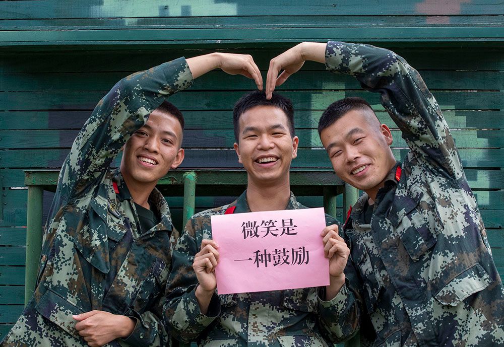 世界微笑日,武警广西总队梧州支队的官兵微笑示意。(图片来源:中新社)