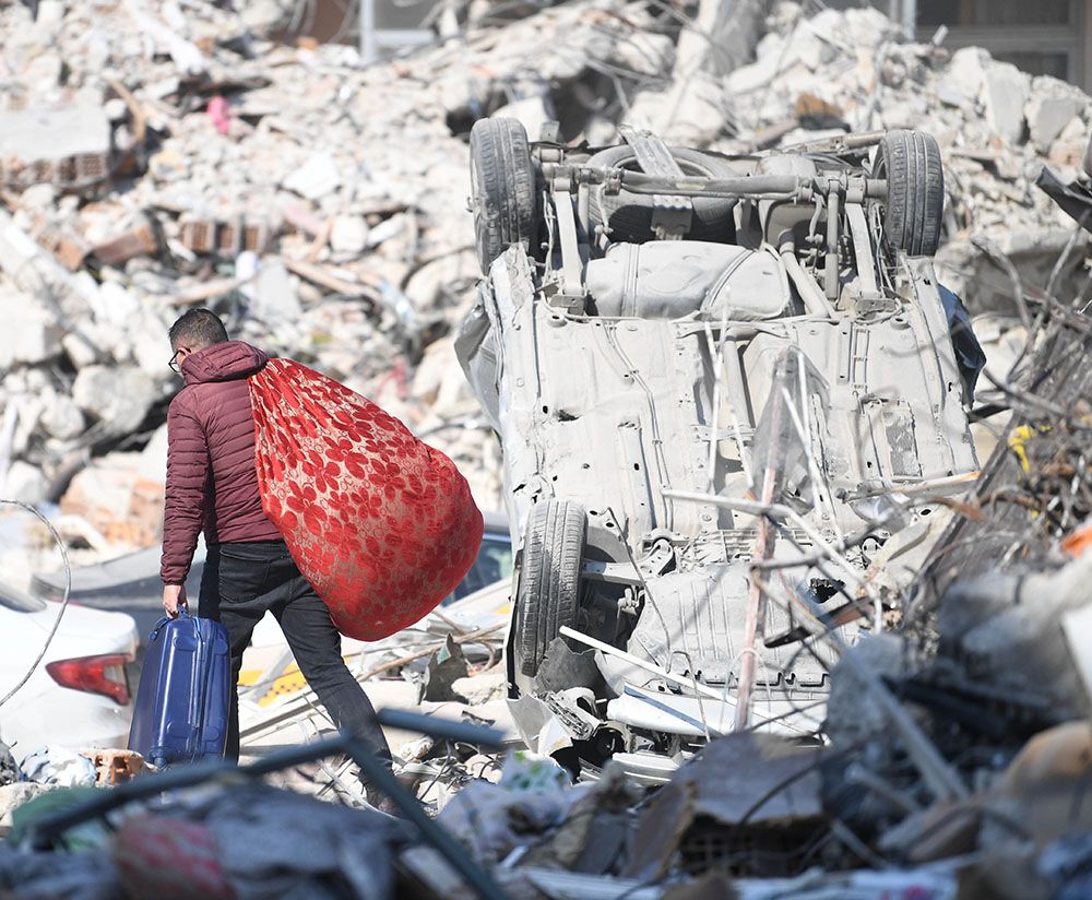 一名男子走在土耳其哈塔伊省安塔基亚市的地震废墟上。(图片来源:新华社)