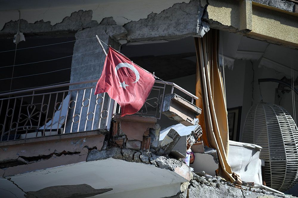 在土耳其哈塔伊省安塔基亚市,遭地震损毁的建筑上悬挂着土耳其国旗。(图片来源:新华社)