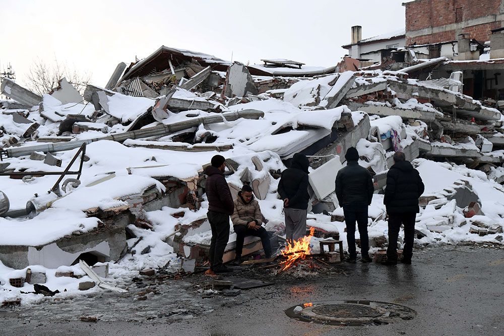在土耳其卡赫拉曼马拉什省南部的埃尔比斯坦地区,受地震影响的人们在废墟旁烧火取暖。(图片来源:新华社)