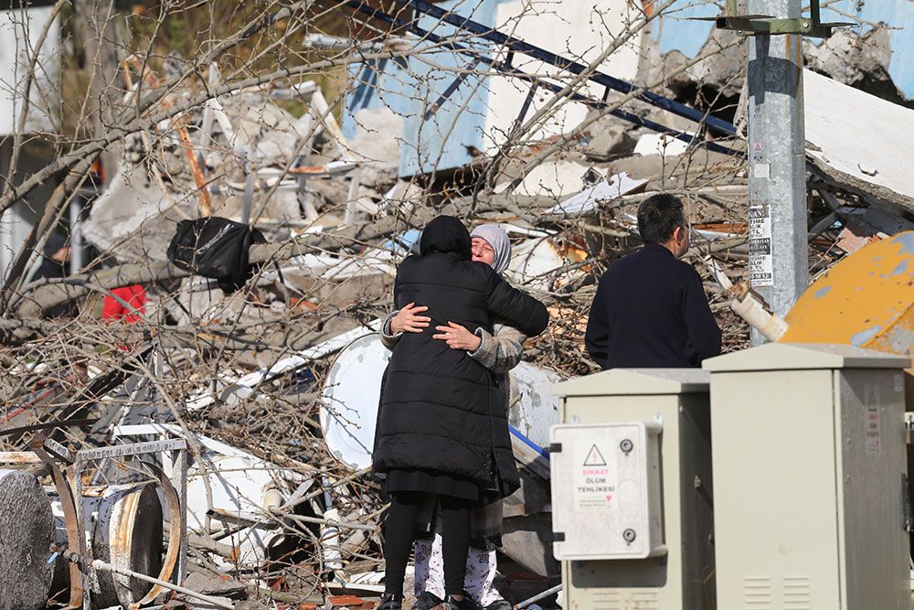 灾民在土耳其南部卡赫拉曼马拉什市一处地震废墟前相互安慰。(图片来源:新华社)