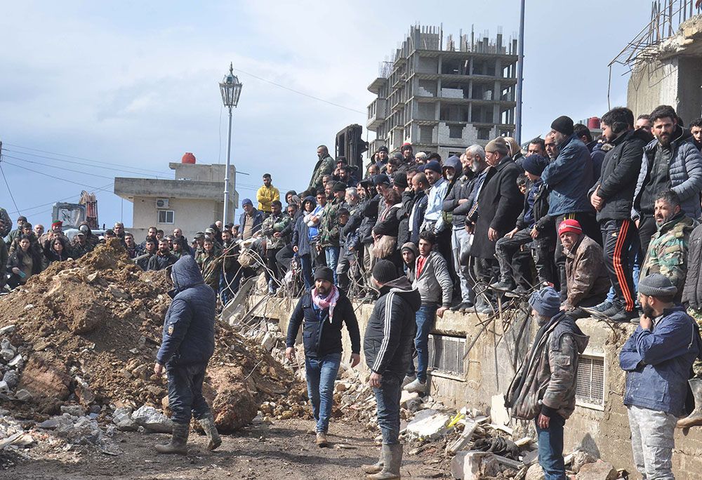 土耳其南部靠近叙利亚边境地区发生强烈地震,造成土耳其和叙利亚两国大量人员伤亡。图为人们聚集在叙利亚拉塔基亚省的一处地震废墟。(图片来源:新华社)