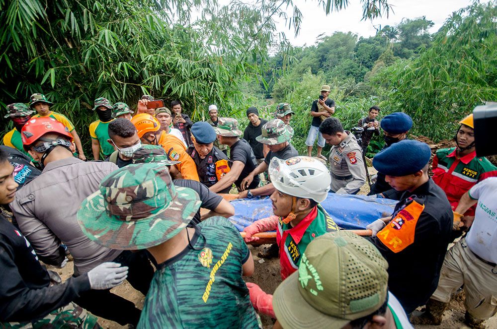 救援人员在印度尼西亚西爪哇省展玉地区地震震中附近的山体滑坡现场搬运遇难者遗体。(图片来源:新华社)
