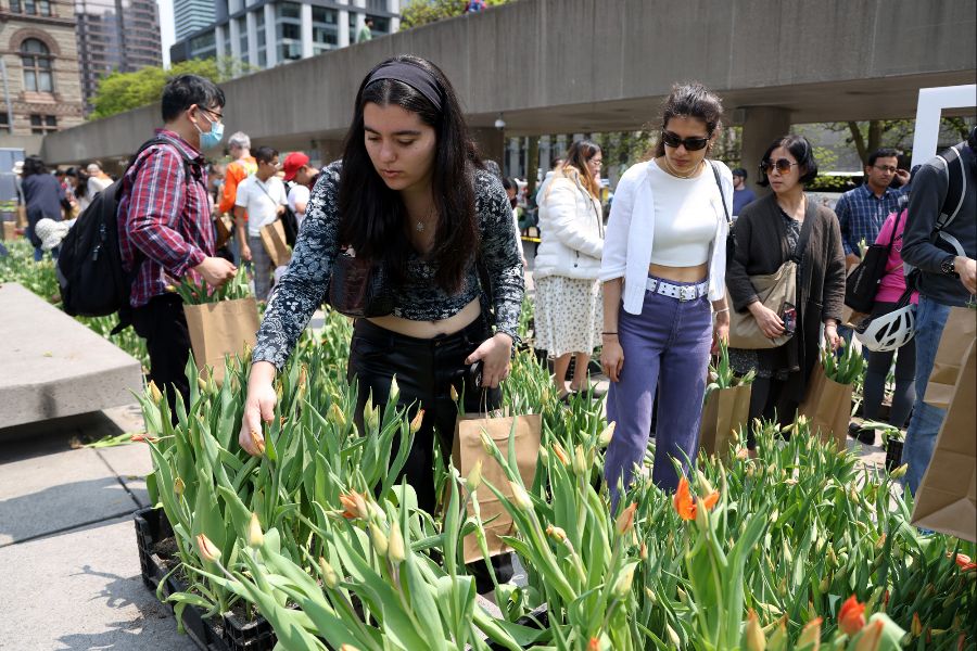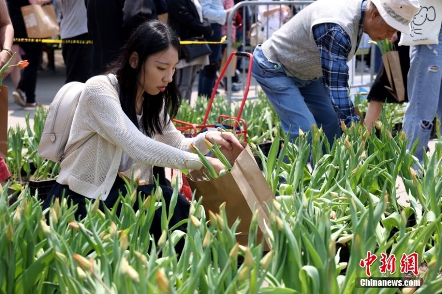 21日,在加拿大多伦多,民众在市政厅广场挑选采摘郁金香花株。(图片来源:中新社)