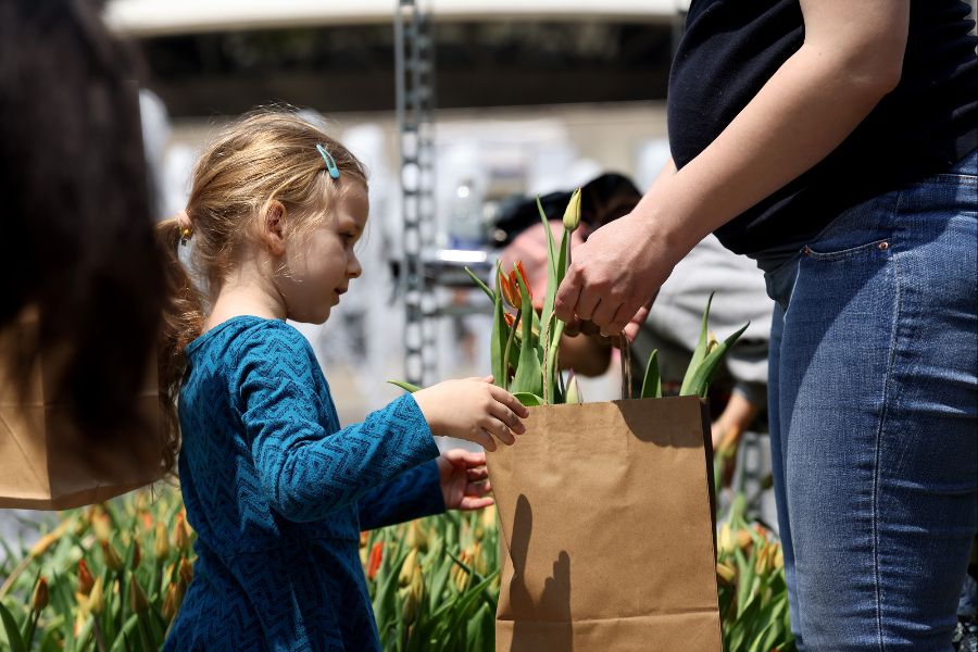 一名女孩跟随母亲在市政厅广场挑选采摘郁金香花株。(图片来源:中新社)