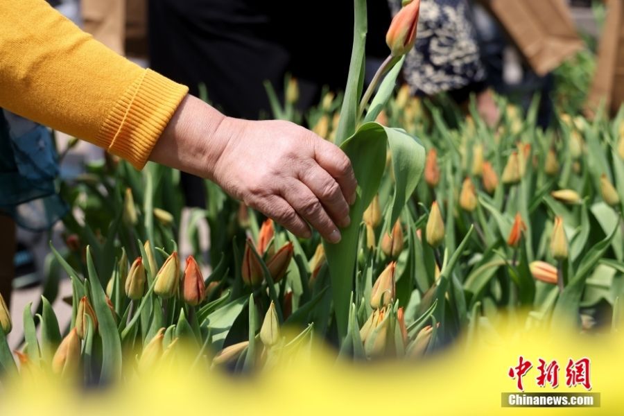 一位女士在市政厅广场挑选采摘郁金香花株。(图片来源:中新网)