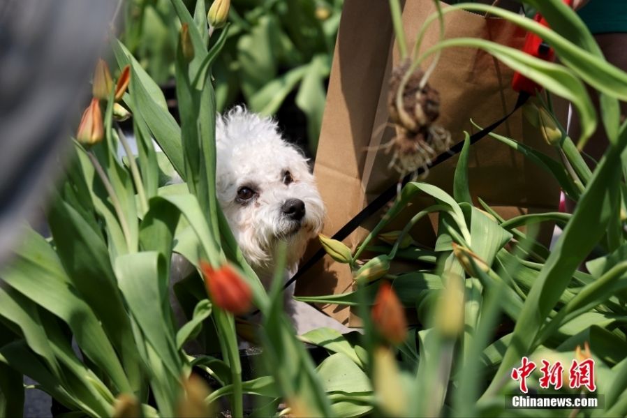一只宠物狗随主人在市政厅广场挑选采摘郁金香花株。(图片来源:中新网)