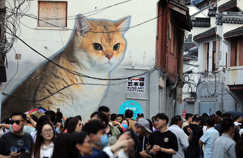 【欧洲时报网】近日中国上海,“外滩猫街”正式对公众开放。老城厢方浜中路两旁的“猫”作品吸引不少市民游客打卡拍照留影。其实由猫衍生出来的事物千奇百怪,有涂鸦墙、文物周边、装置艺术、雕塑等等,让我们一起来看看吧。