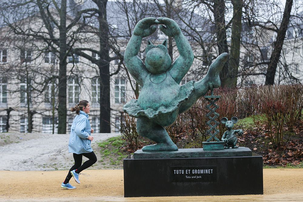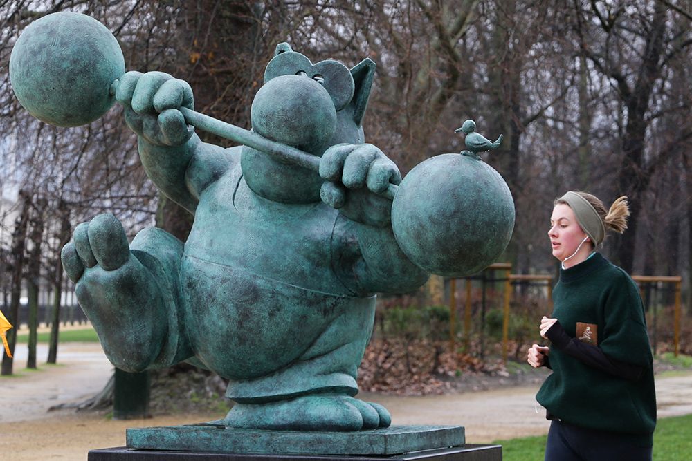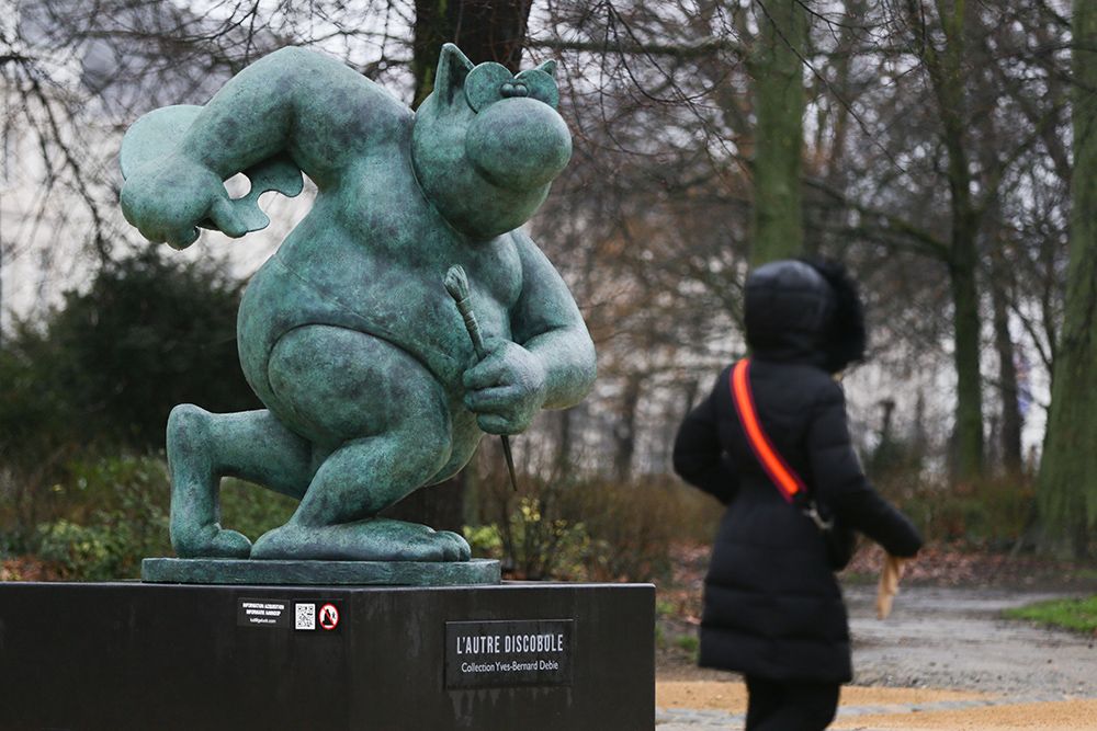 22尊形态各异的“猫”雕塑亮相比利时布鲁塞尔公园,吸引人们驻足观看。这是比利时漫画家菲利普·葛洛克知名连环画《猫》中的经典形象。(图片来源:新华社)