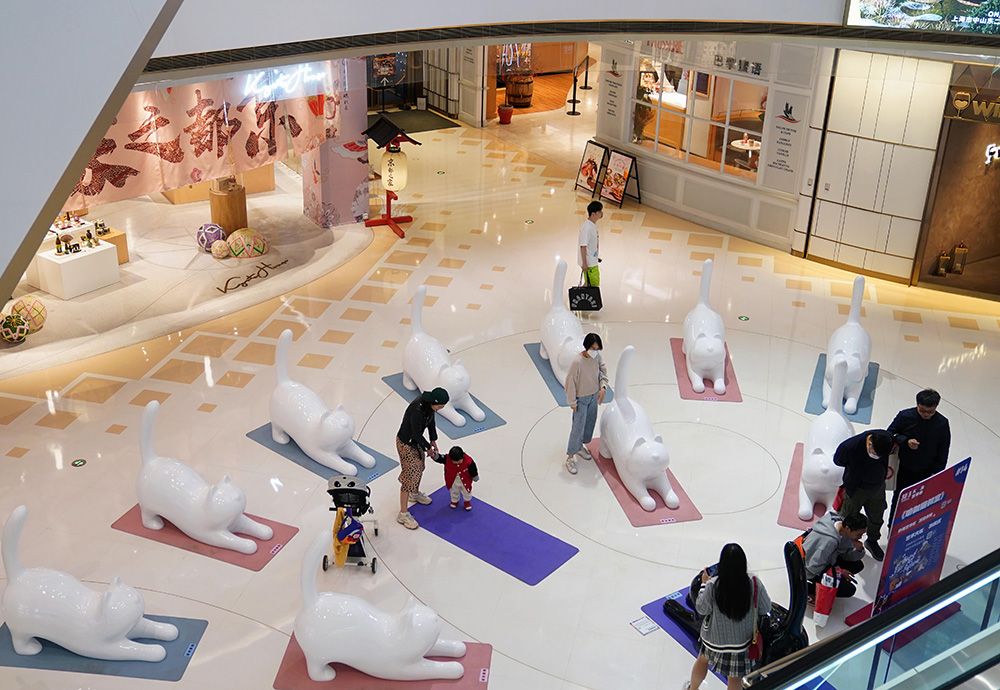 游客在中国上海金融中心商场参观艺术装置《瑜伽猫教室》。(图片来源:新华社)