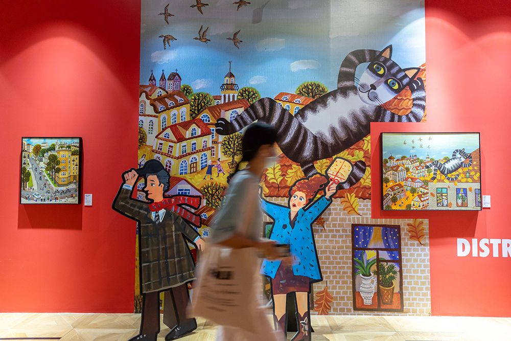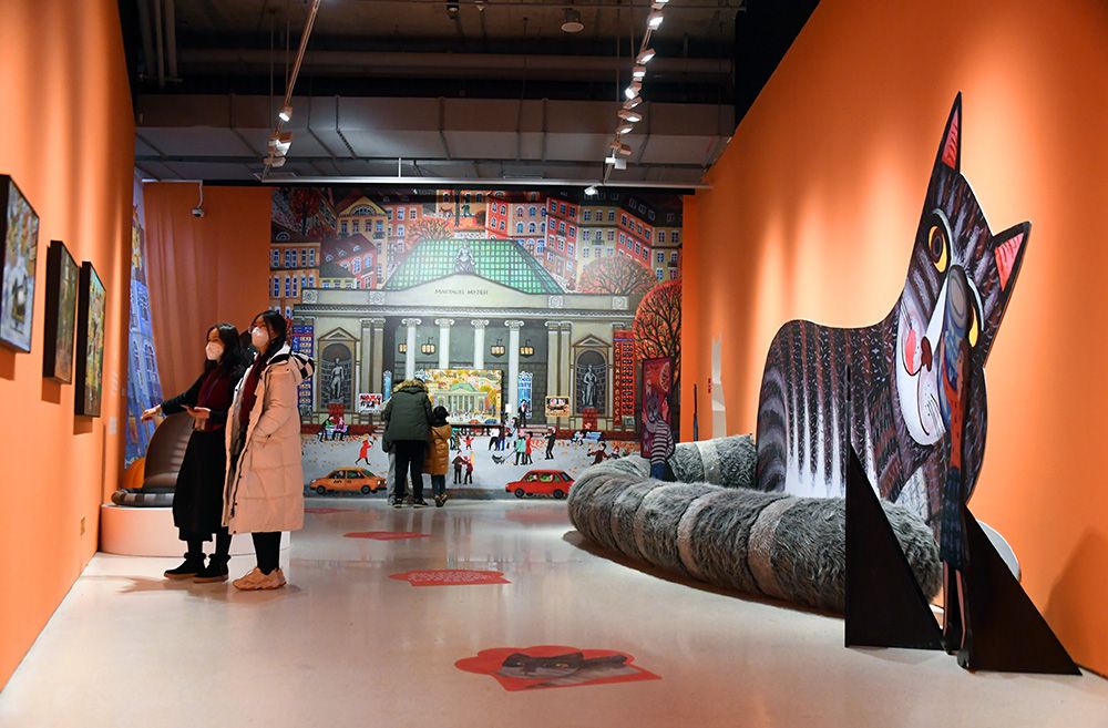《喵趣奇境:白俄罗斯稚拙艺术特展》在中国上海世博会博物馆展出。本次展览集中展示白俄罗斯稚拙艺术作品,以猫咪形象为线索,展现城市文化、自然风光和民众生活。可爱的卡通猫咪形象吸引众多市民前来驻足观赏。(图片来源:中新社)