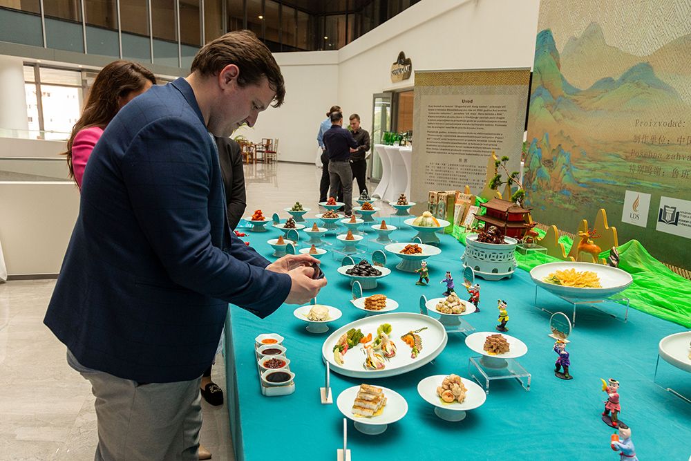 人们在塞尔维亚鲁班工坊揭幕仪式暨“风雅·宋宴”美食文化展上欣赏中国美食。(图片来源:新华社)