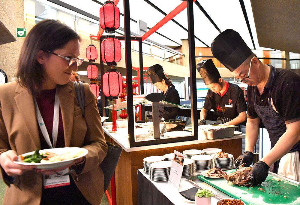 嘉宾在《湿地公约》第十四届缔约方大会瑞士日内瓦分会场的中国美食展上品尝北京烤鸭。(图片来源:新华社)