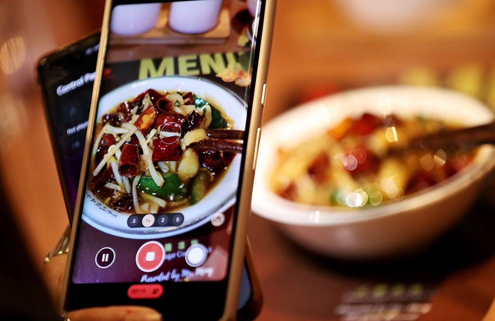在英国伦敦,一名食客在“寻味英伦品味重庆”活动现场拍摄重庆沸腾鱼。(图片来源:新华社)