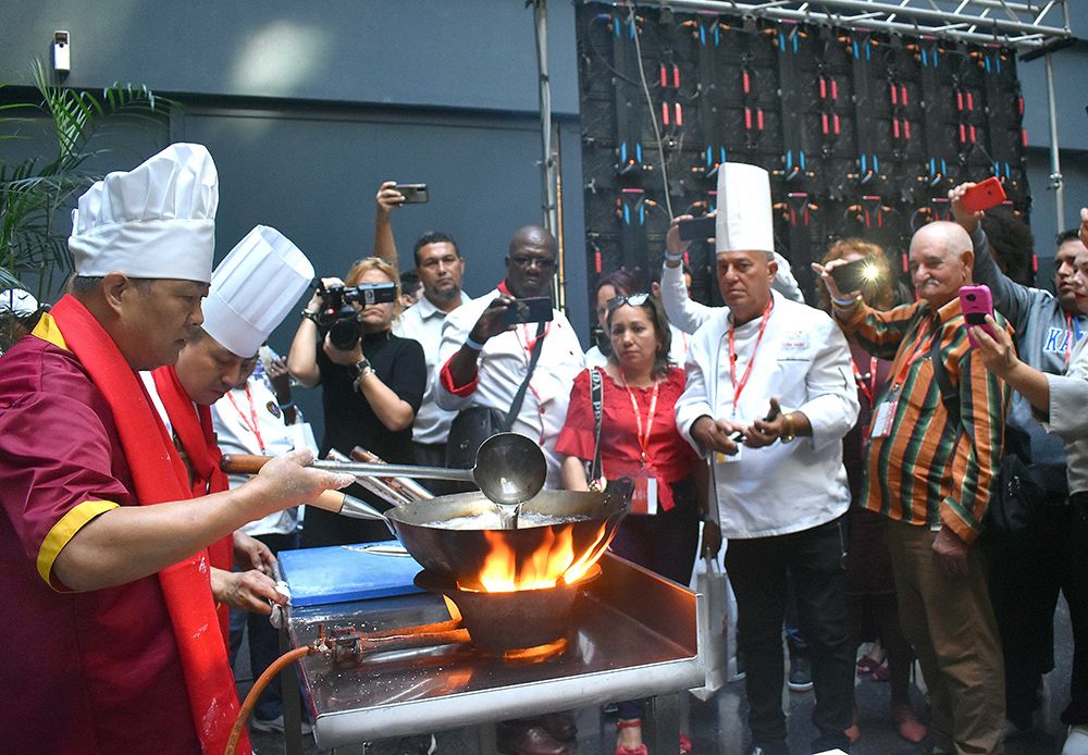 在古巴首都哈瓦那,中国厨师(左)在2023年古巴国际美食节上展示厨艺。(图片来源:新华社)