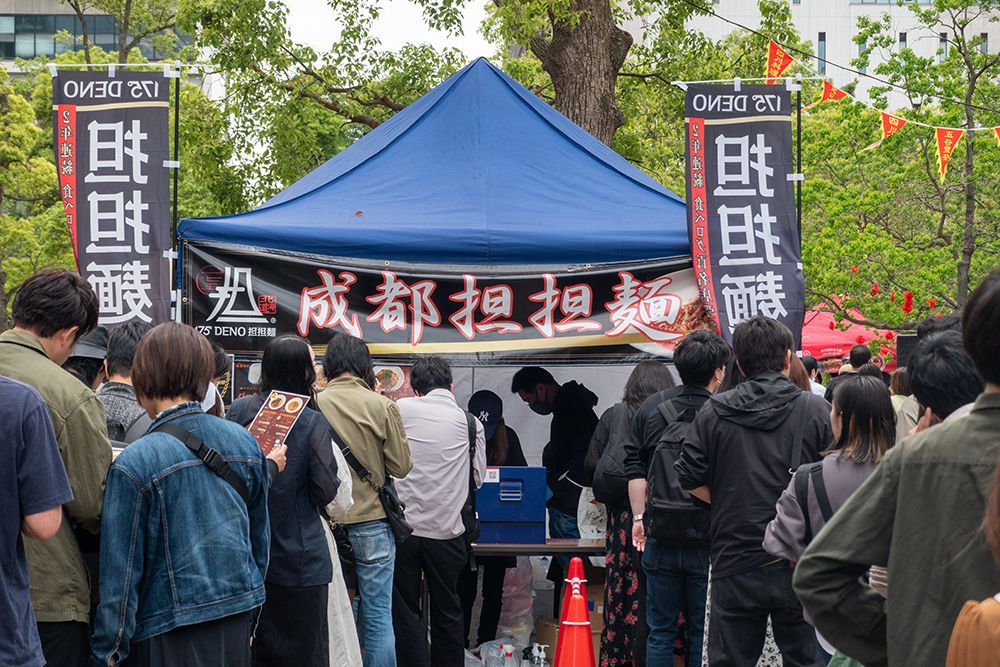 人们在日本东京中野中央公园四川美食节上排队购买食物。(图片来源:新华社)