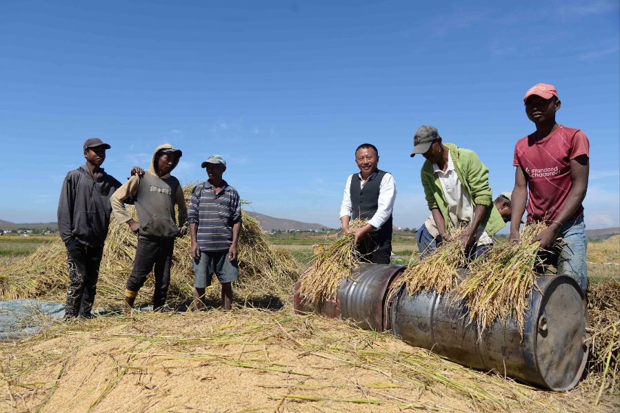 5月的马达加斯加正值金秋。在距离首都塔那那利佛35公里外的马义奇镇,中国国家杂交水稻工程技术研究中心非洲分中心的试验田里,65岁的中国杂交水稻技术专家胡月舫正与当地农民们一起抢收本季的最后一批水稻。(图片来源:本文图片均综编自新华社)