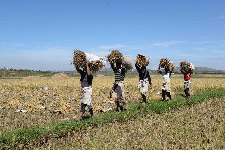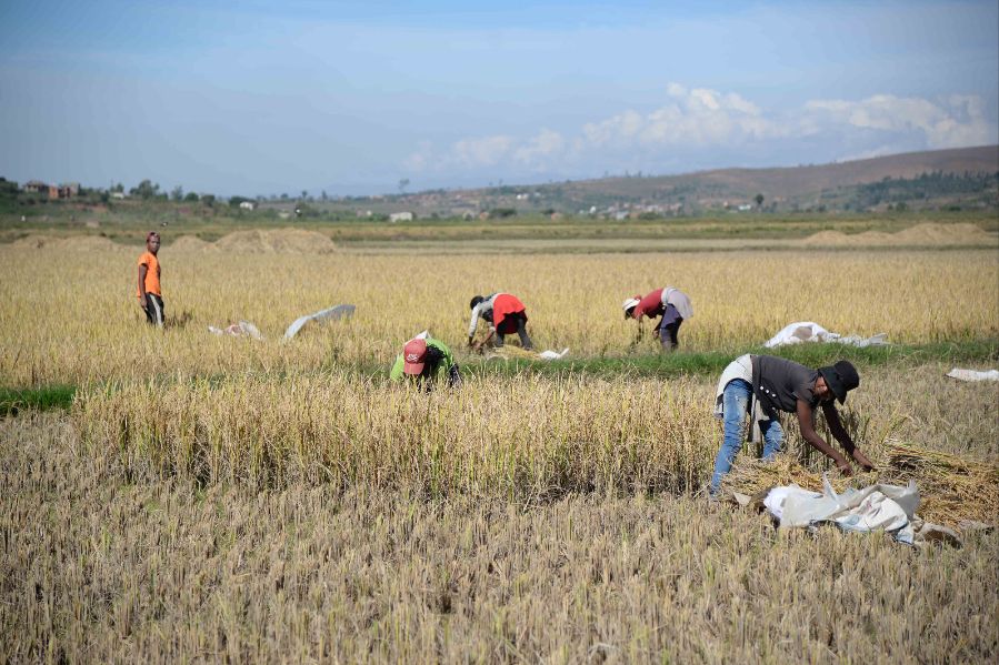 水稻是马达加斯加的主要农作物,受制于种子质量、种植技术、基础设施等多重因素,马达加斯加的稻米仍需依赖进口。为实现粮食自给自足,自2007年开始,马达加斯加与中国展开杂交水稻技术合作。图为图为5月12日,农民在中国国家杂交水稻工程技术研究中心非洲分中心的试验田里收获水稻。