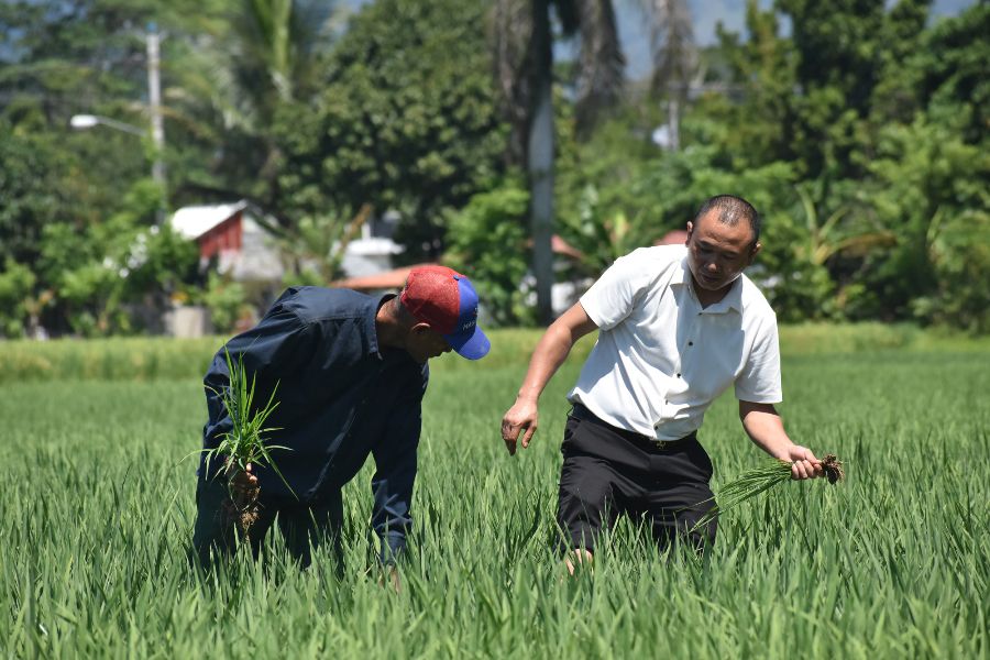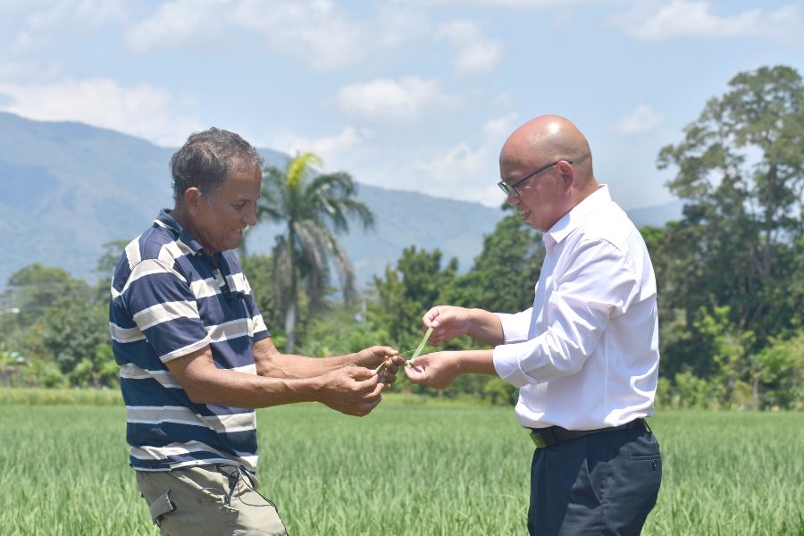 此外,中国专家将引进中国先进农业机械设备和优秀种植技术,帮助多米尼加提高机械化生产水平和农业生产病虫害防控水平,从而进一步提升当地水稻产量和品质。未来,中国专家还将对当地农技人员和农户进行更多培训。图为中国农业专家(右)和一名多米尼加水稻专家(左)在多米尼加国家水稻培训中心的一片试验田内讨论水稻种植问题。