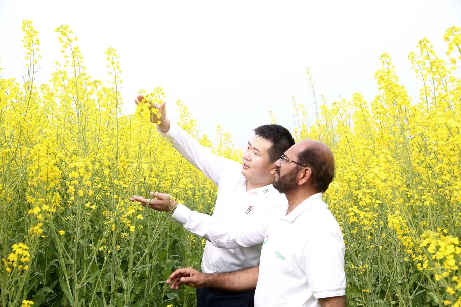 2022年,中国武汉庆发禾盛农业发展有限公司与巴基斯坦的种业公司签署了在巴开发油菜品种和食用油产业链的谅解备忘录,推广种植通过中国先进农业技术选育出的新一代甘蓝型杂交双低油菜品种作物,古杰兰瓦拉就是重点推广区域。图为2023年2月,在古杰兰瓦拉的油菜田,武汉庆发禾盛农业发展有限公司国际业务部总监周旭升(左)和巴基斯坦合作方农业技术人员查看通过中国技术选育出的新一代甘蓝型杂交双低油菜作物长势情况。