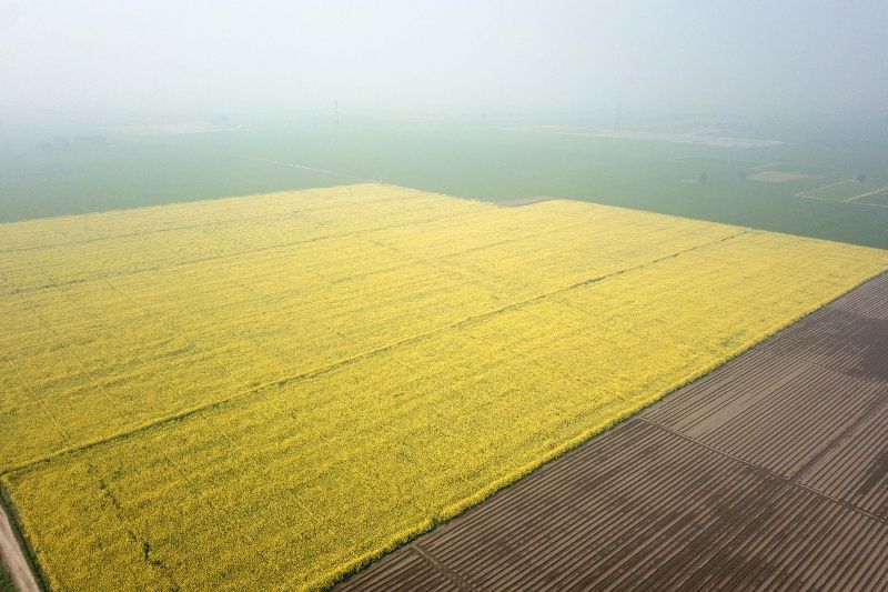 穆罕默德·阿齐姆是周旭升在当地的合作团队负责人。他说,与其他作物相比,今年他们推广种植的中国油菜籽产量大丰收,农民们都很高兴。图为在巴基斯坦东部旁遮普省古杰兰瓦拉航拍的通过中国农业技术选育出的新一代甘蓝型杂交双低油菜田。