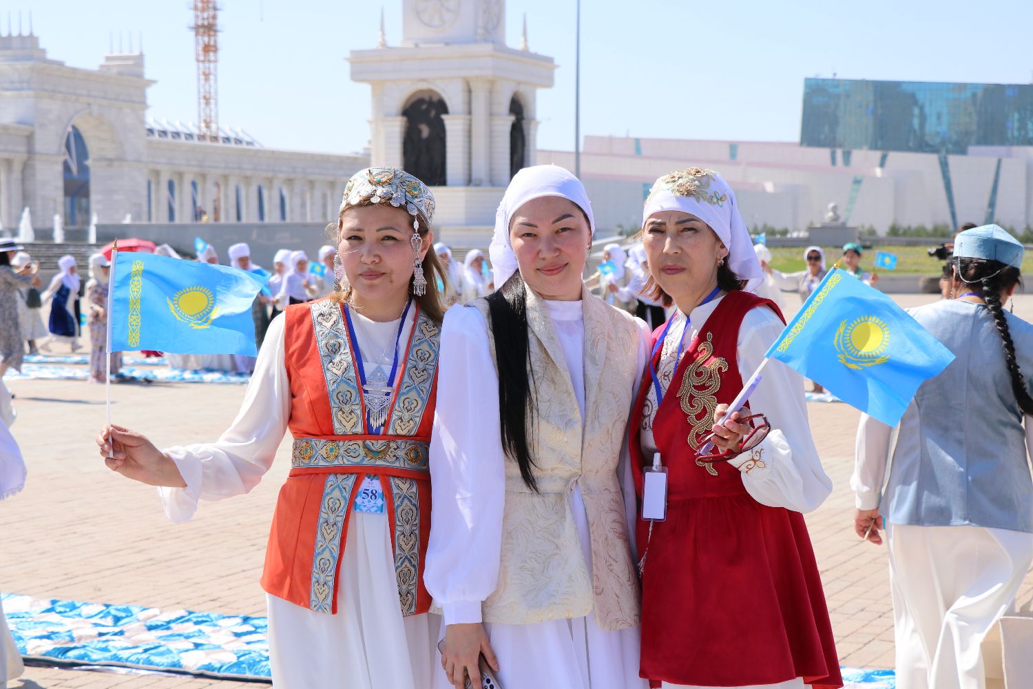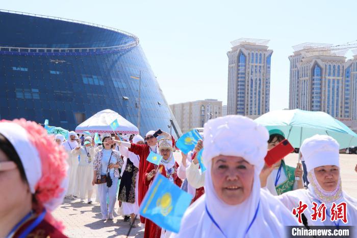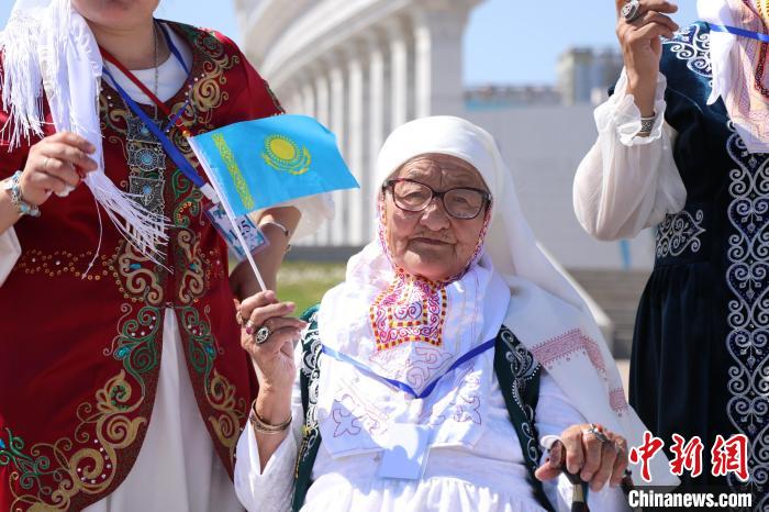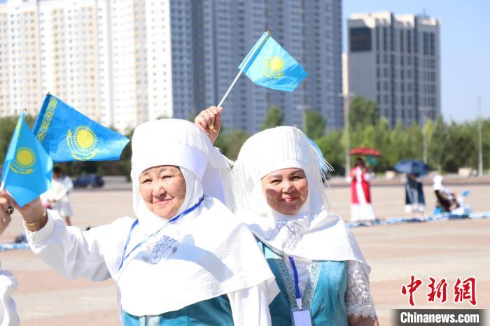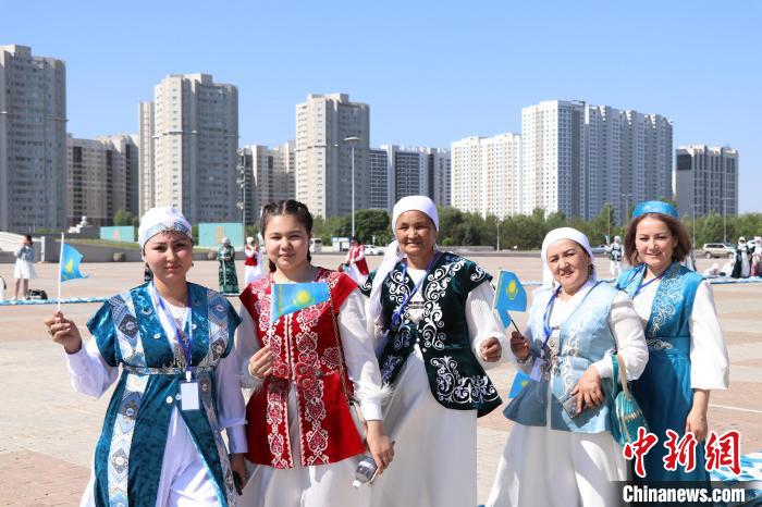 6月4日,身着当地传统服饰的民众在哈萨克斯坦首都阿斯塔纳参加国家象征日庆祝活动。(图片来源:中新社)