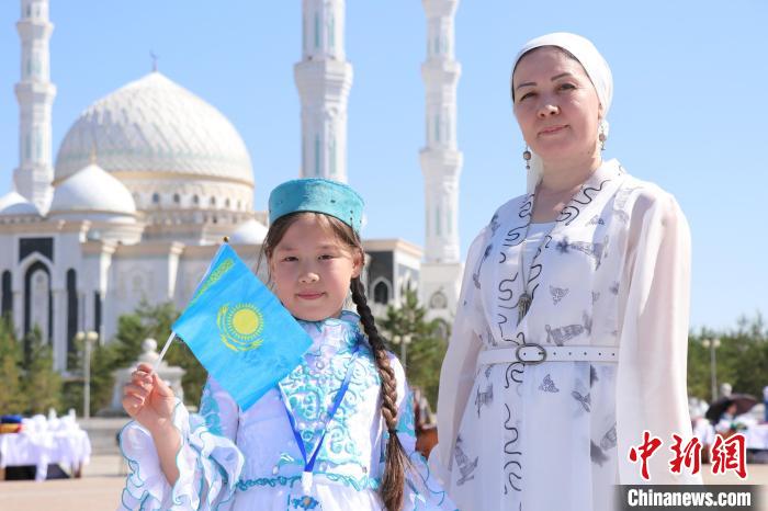 6月4日,哈萨克斯坦阿斯塔纳,一名哈萨克斯坦小姑娘在家长的带领下参加节日庆祝活动。(图片来源:中新网)
