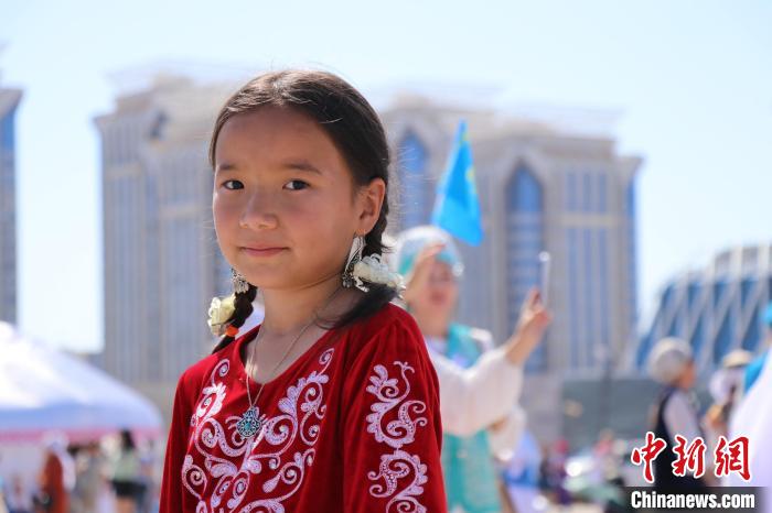 6月4日,哈萨克斯坦阿斯塔纳,一名哈萨克斯坦小姑娘参加庆祝活动。(图片来源:中新网)