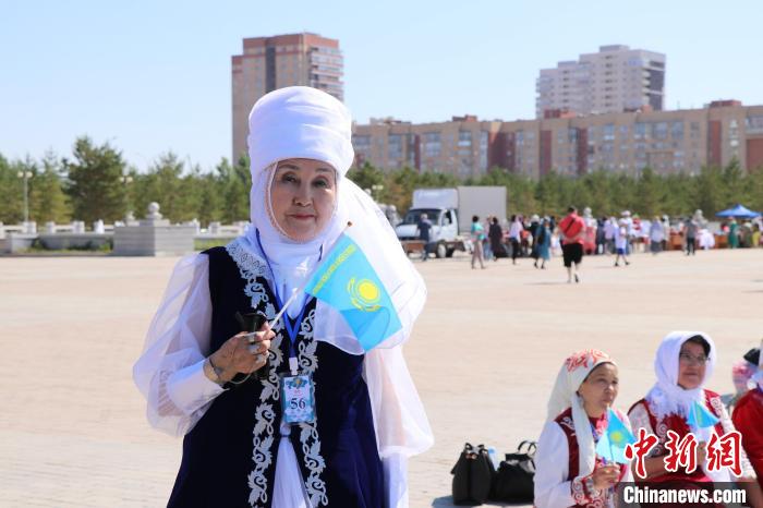 6月4日,哈萨克斯坦阿斯塔纳,一名哈民众身着当地传统服饰参加庆祝活动。(图片来源:中新网)