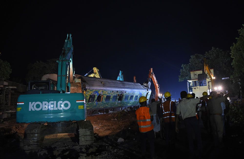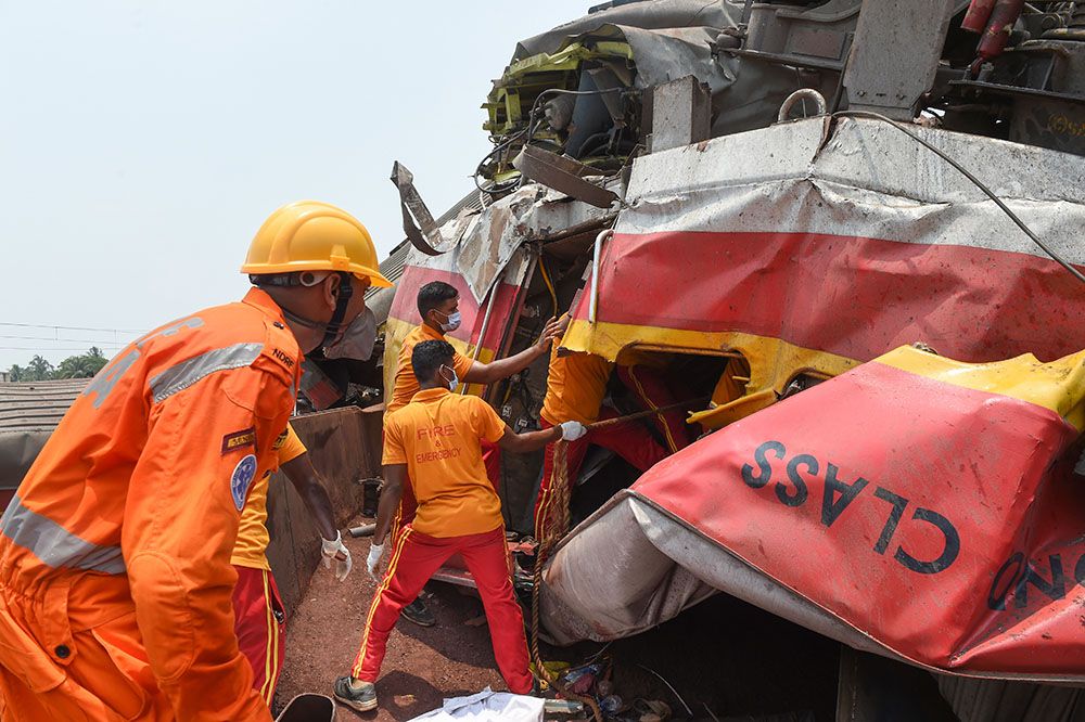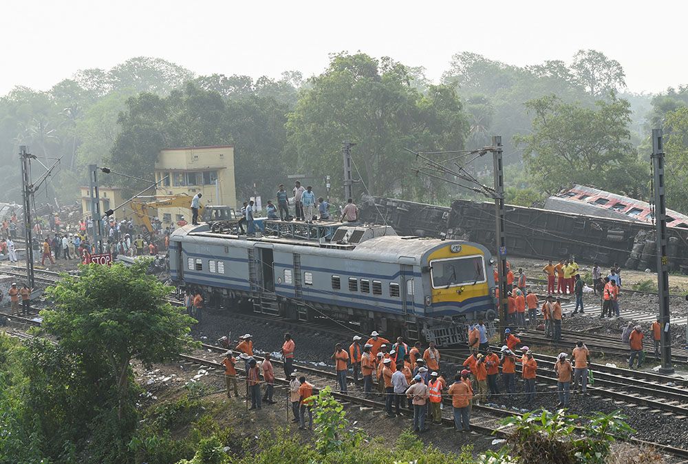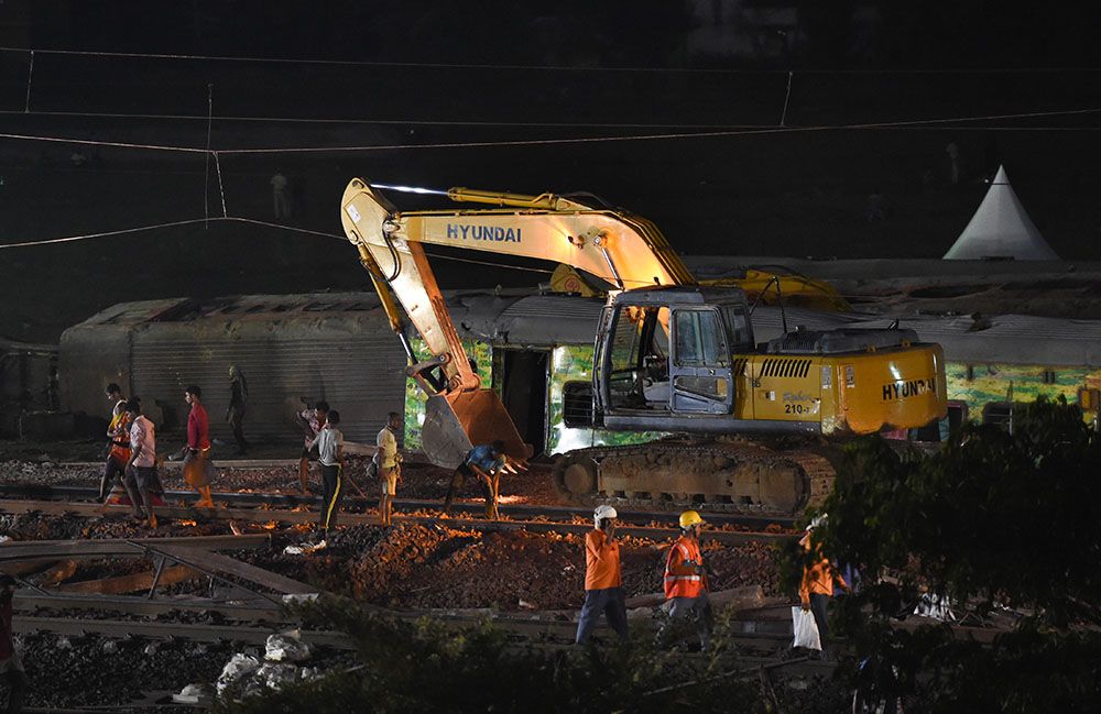 救援人员在印度奥迪沙邦巴拉索尔地区的列车脱轨相撞事故现场工作。