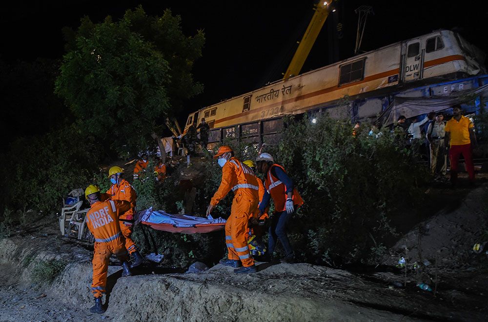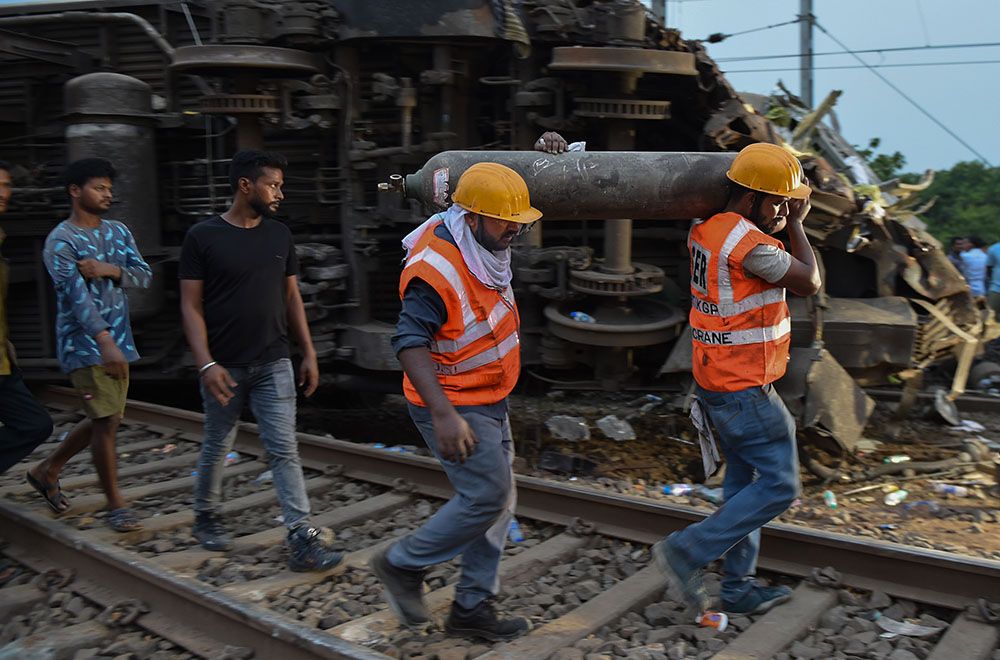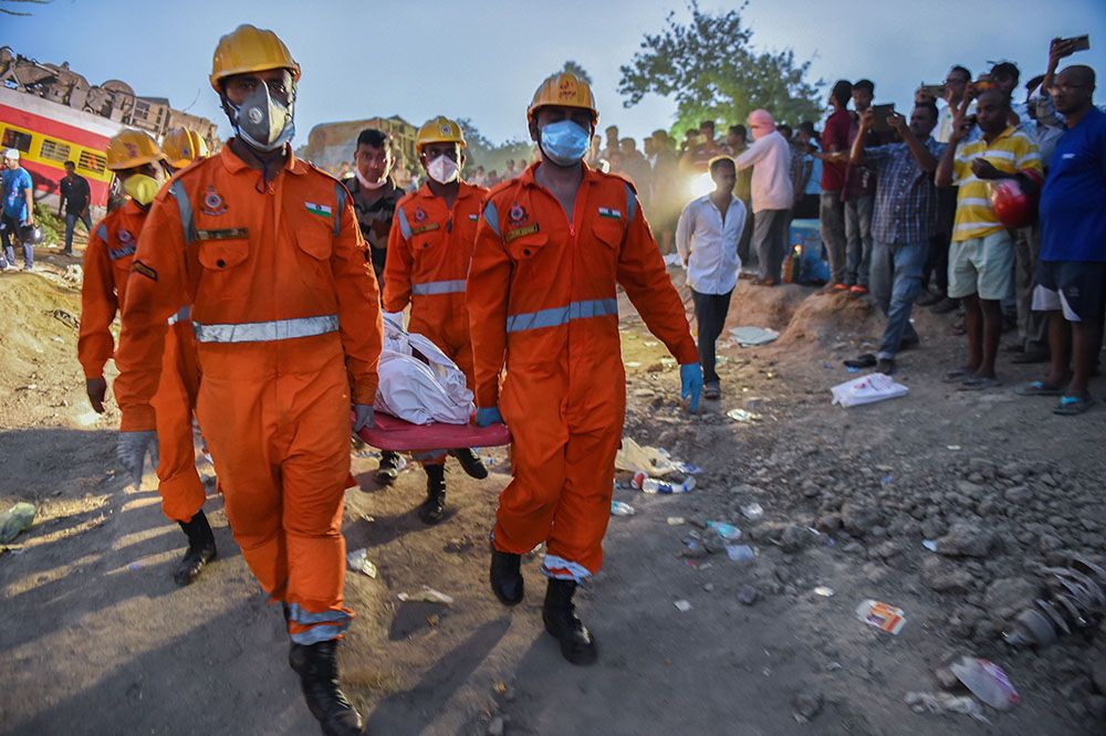 6月3日,救援人员在印度奥迪沙邦巴拉索尔地区的列车脱轨相撞事故现场转移遇难者遗体。