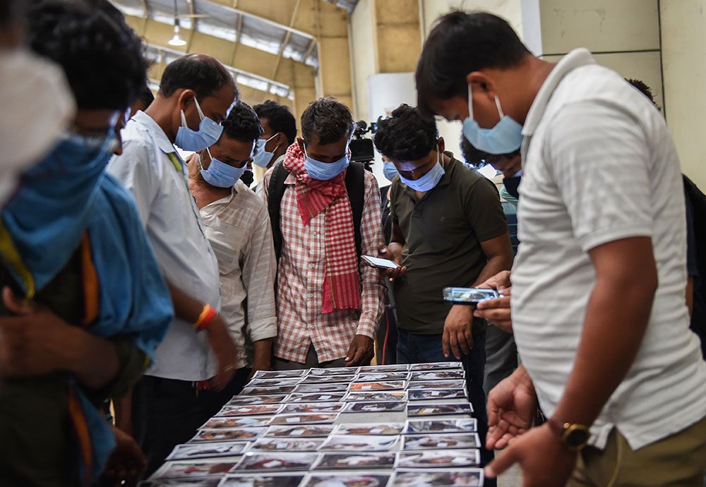 在印度奥迪沙邦巴拉索尔地区,失联乘客亲属查看遇难者遗体照片。