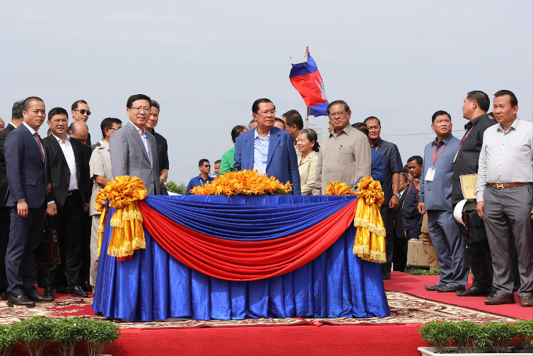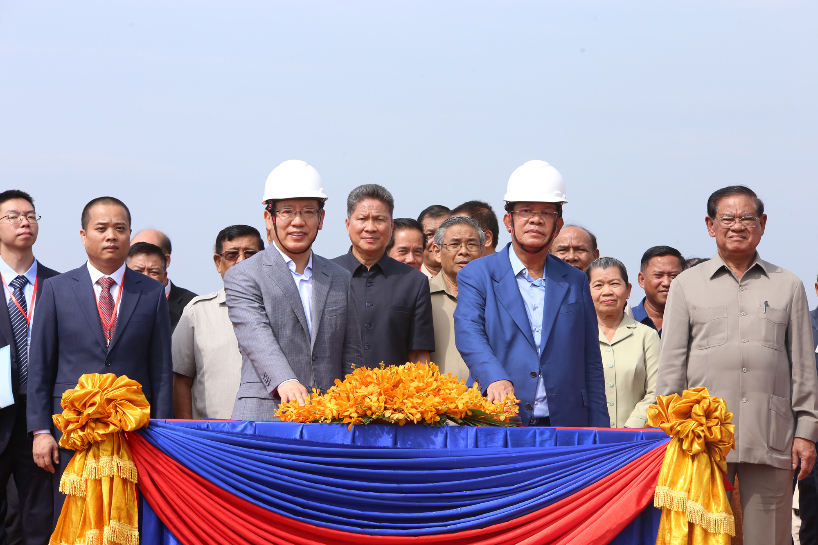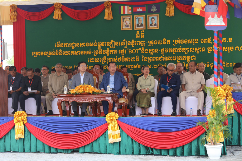 金巴高速项目6月7日在干丹省举行开工仪式,柬埔寨首相洪森、中国驻柬埔寨大使王文天等出席仪式。图为柬埔寨首相洪森(前排右)与中国驻柬埔寨大使王文天(前排左)在柬埔寨干丹省出席高速公路开工典礼。(图片来源:新华社)