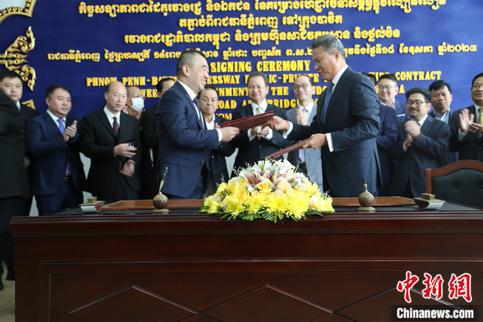 中国路桥工程有限责任公司与柬埔寨公共工程与运输部5月18日签署金边—巴域高速公路项目主合同及相关附件,标志着该项目正式落地。图为中国路桥公司总经理助理兼柬埔寨办事处总经理周勇(前左)、柬埔寨国务兼公共工程与运输大臣孙占托(前右)代表双方签约。(图片来源:中新网发/中国路桥供图)