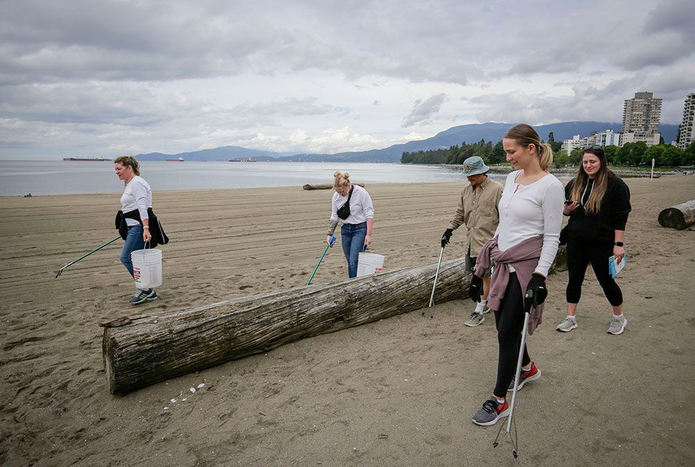 志愿者在加拿大温哥华的海岸边清理垃圾。(图片来源:新华社)