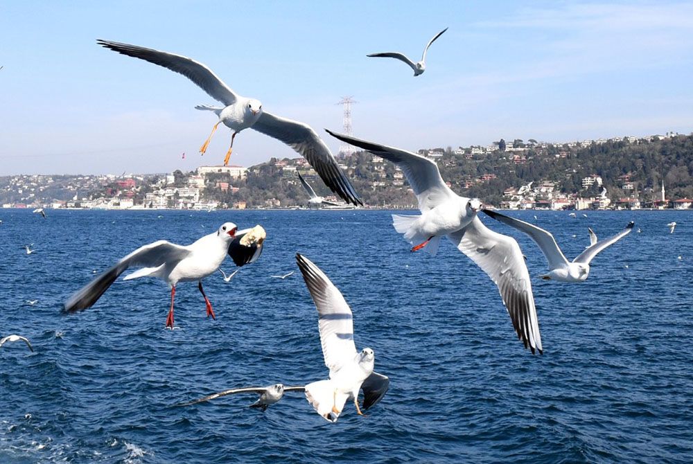 海鸥在土耳其伊斯坦布尔的博斯普鲁斯海峡水面觅食。(图片来源:新华社)