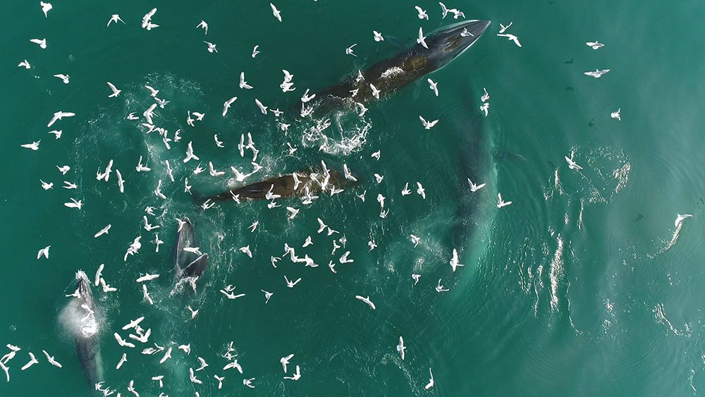 在中国广西涠洲岛附近海域,一群布氏鲸在捕食。(图片来源:新华社)