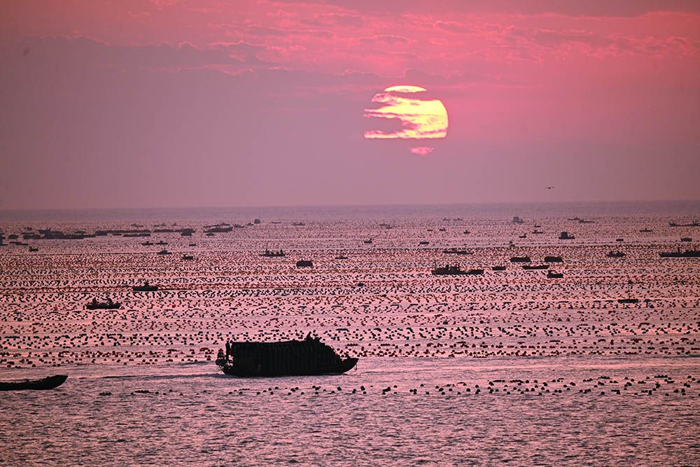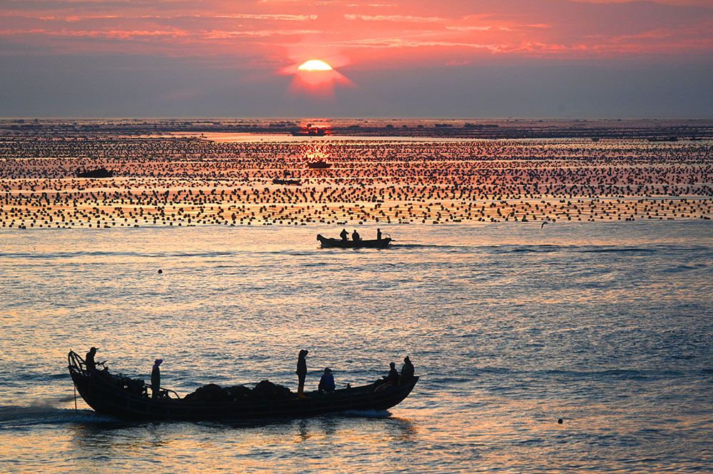 山东荣成爱伦湾海洋牧场晨曦美景如画。(图片来源:中新社)