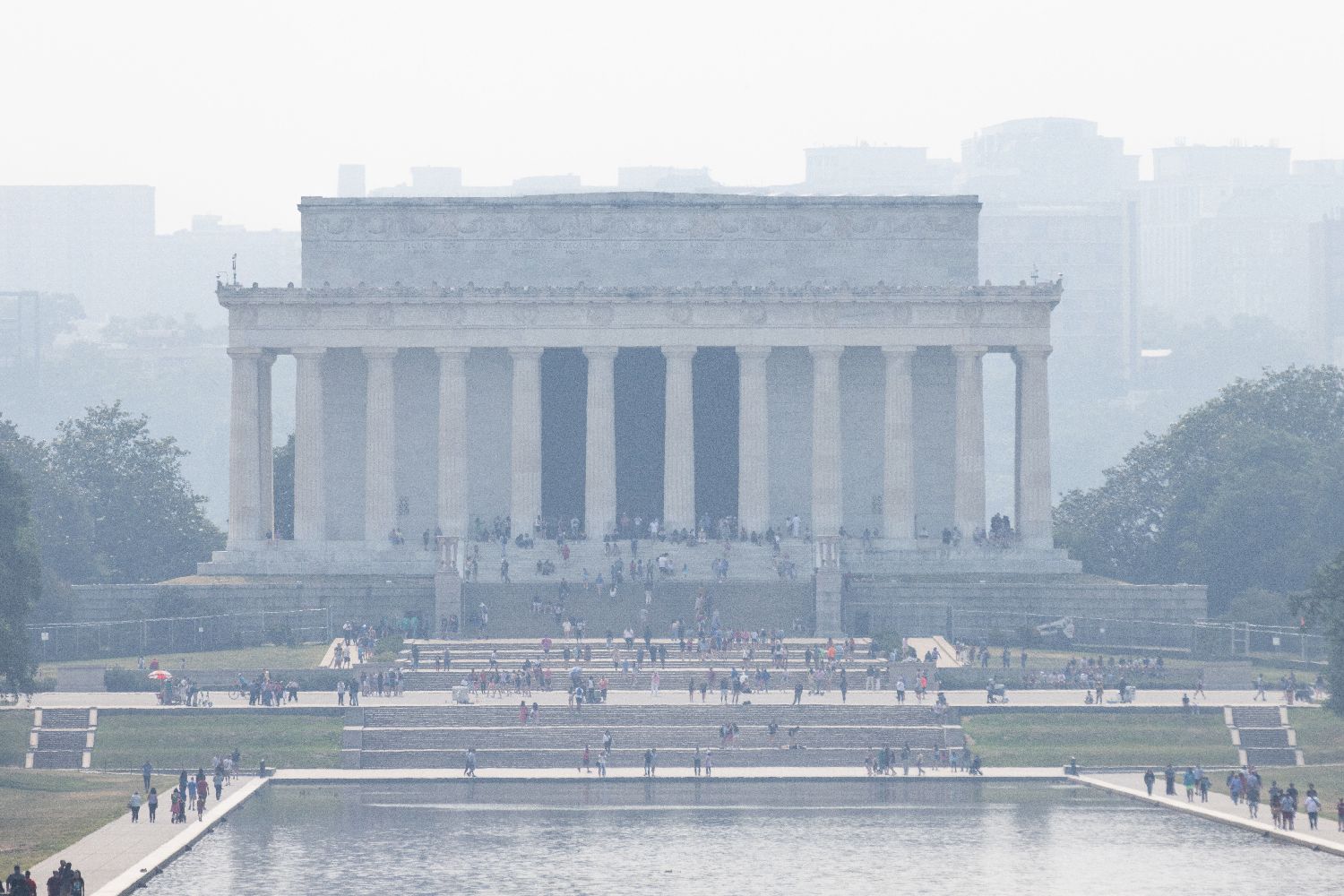 华盛顿8日遭遇连日来最严重的空气污染天气。继7日发布空气污染“红色预警”(PM2.5指数151-200)后,华盛顿8日一早便发布了“紫色预警”(PM2.5指数201-300)。图为6月7日在美国首都华盛顿拍摄的烟尘笼罩的林肯纪念堂。(图片来源:新华社)