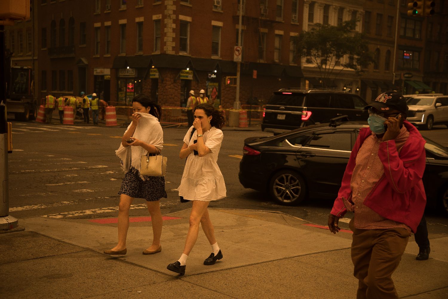 由于空气污染严重,白宫不得不推迟原定8日晚举行的一场庆典活动。美国国家动物园当天也被迫关闭。图为6月7日,行人以手掩住口鼻走在烟尘笼罩的美国纽约街头。(图片来源:新华社)