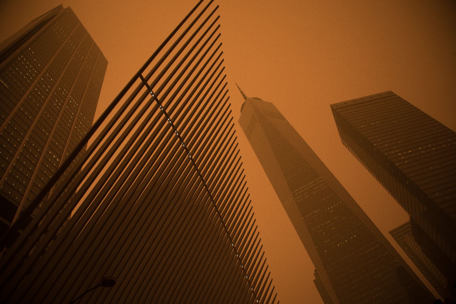 6月7日是加拿大今年的“清洁空气日”。但从加西到加东的广泛地区正被多地肆虐和蔓延的山林野火所导致的雾霾烟尘笼罩。图为6月7日拍摄的烟尘笼罩下的美国纽约世贸中心。(图片来源:新华社)