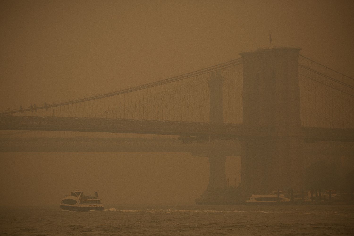 目前有近千名来自美国、澳大利亚、新西兰、南非的消防员正帮助加拿大各地应对火灾。图为6月7日,渡轮在烟尘笼罩的美国纽约东河上航行。(图片来源:新华社)