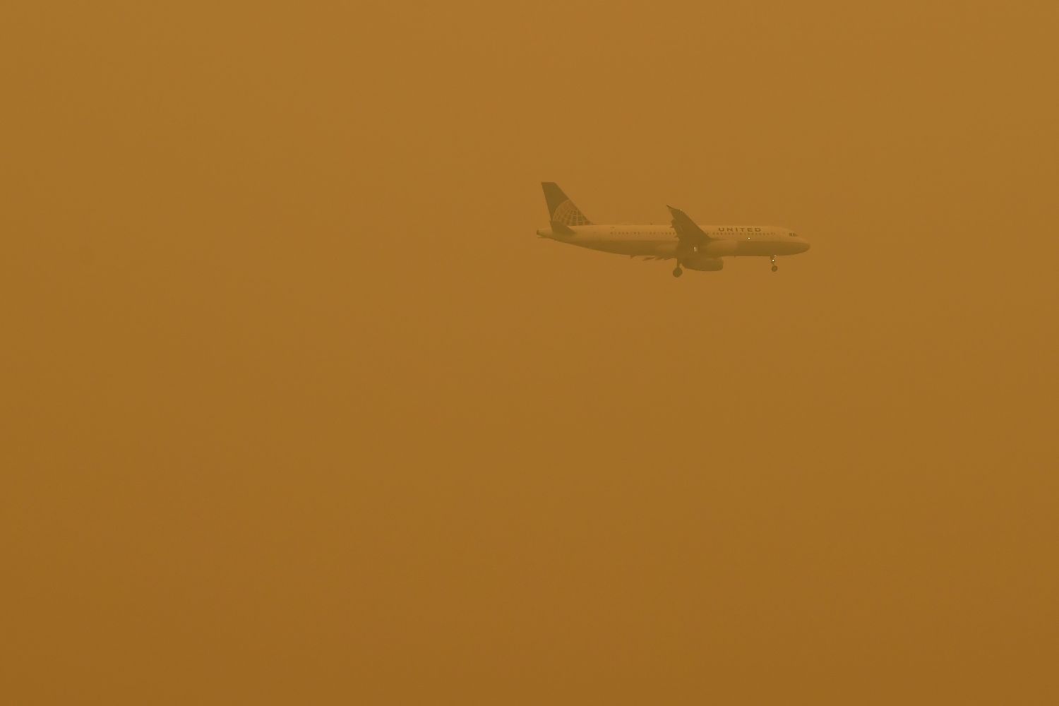 6月7日,一架飞机从烟尘笼罩的美国纽约上空飞过。(图片来源:新华社)