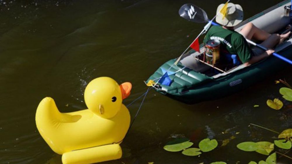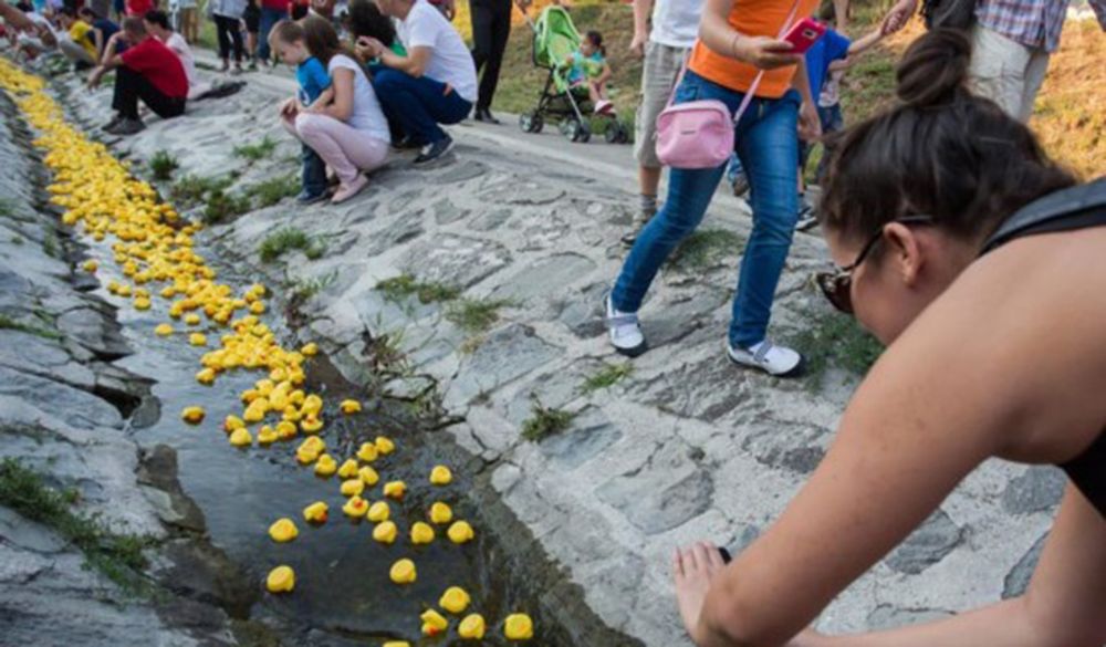 在匈牙利圣安德烈市,人们在“大黄鸭漂流赛”中向小溪里放置“鸭子”。(图片来源:新华社)