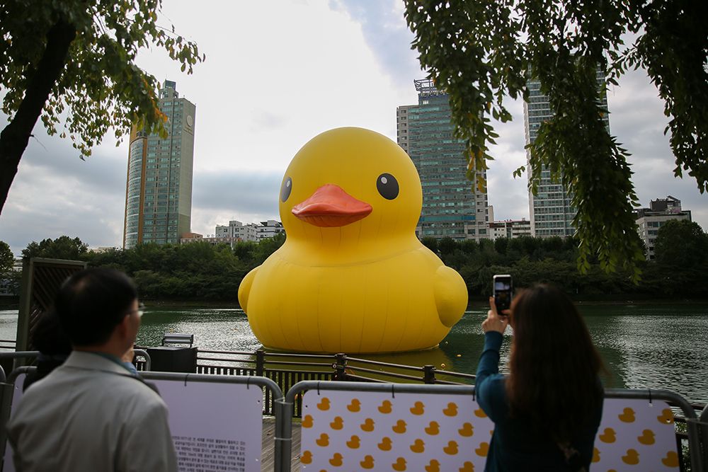 市民在韩国首尔石村湖观看和拍摄艺术作品“大黄鸭”。(图片来源:新华社)