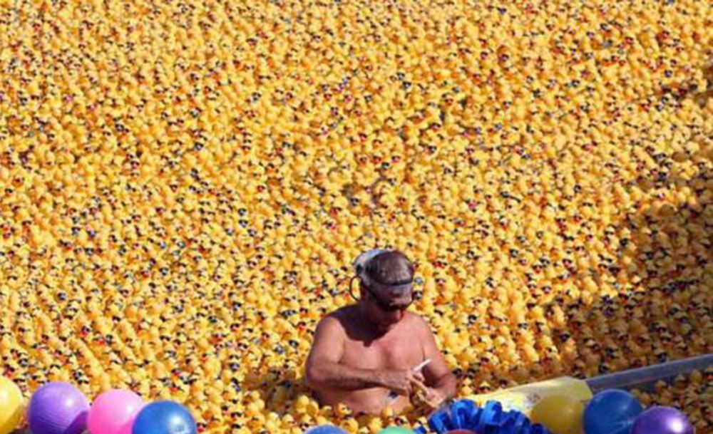 在墨西哥坎昆的尼楚普特湖,一名男子在当地的“大黄鸭漂流赛”开始前检查12000名“参赛选手”。(图片来源:新华社)