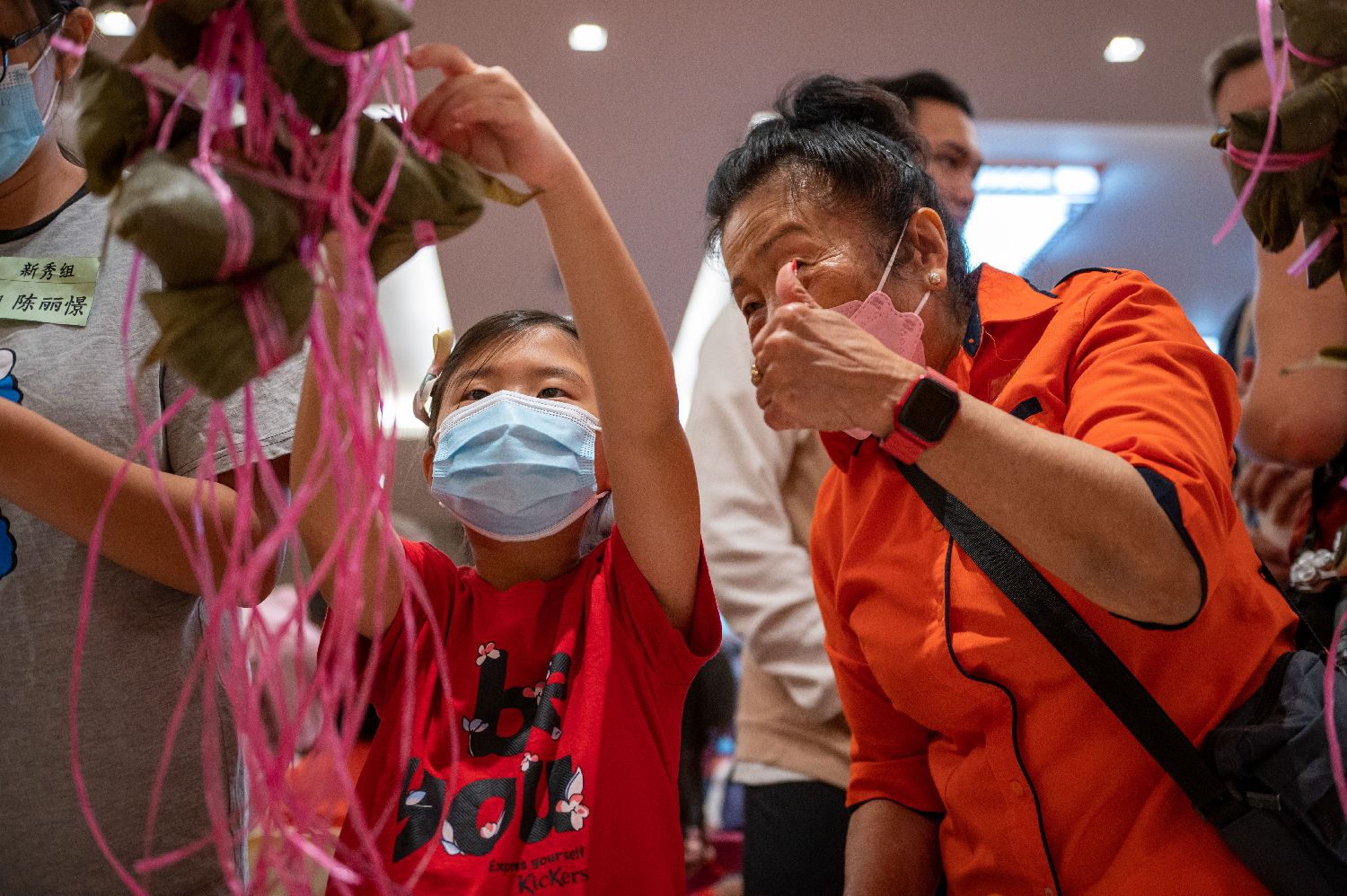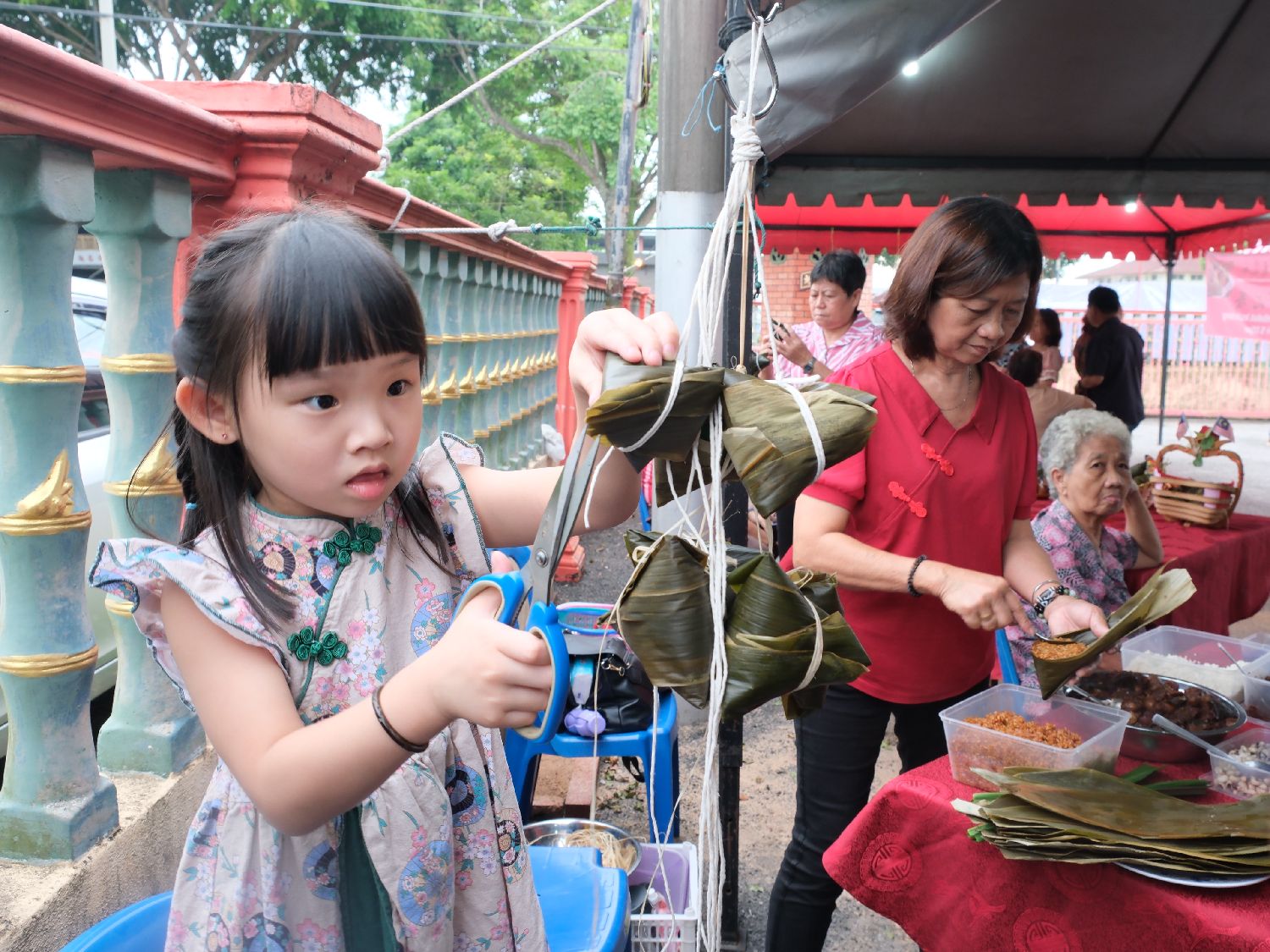 6月18日,马来西亚马六甲举行端午龙舟系列活动,包括游龙舟、裹粽比赛等,吸引当地各族裔民众参与。图为有的家庭四代同堂齐上阵,奶奶在一旁包粽子,四岁的曾馨怡小朋友给包好的粽子修剪粽叶。(图片来源:中新社)