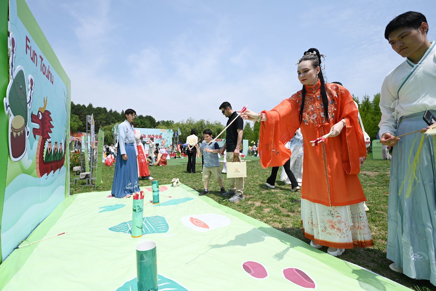6月16日,一场外国友人体验端午节习俗的活动在中国吉林长春举行,近百名外国友人通过穿汉服、品尝粽子、戴香包、投壶等“沉浸式”体验活动,感受中国传统节日的魅力。图为外国人在体验投壶。(图片来源:中新社)