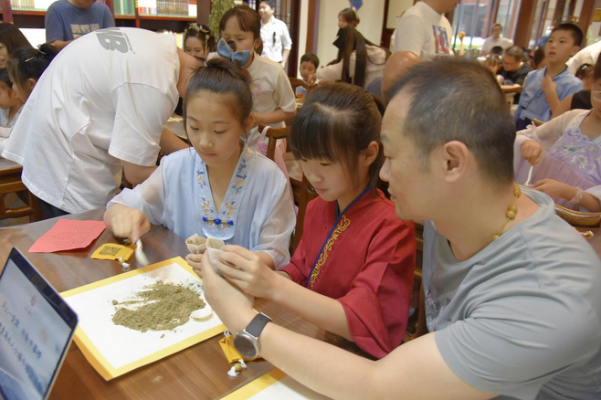 6月18日上午,“同上一堂课,共叙中华情”汉港澳台青少年共迎端午活动在中国湖北经心书院大讲堂内举办,当天,大家一起做香囊、扎菖蒲、向父母礼敬作品。(图片来源:央广网)