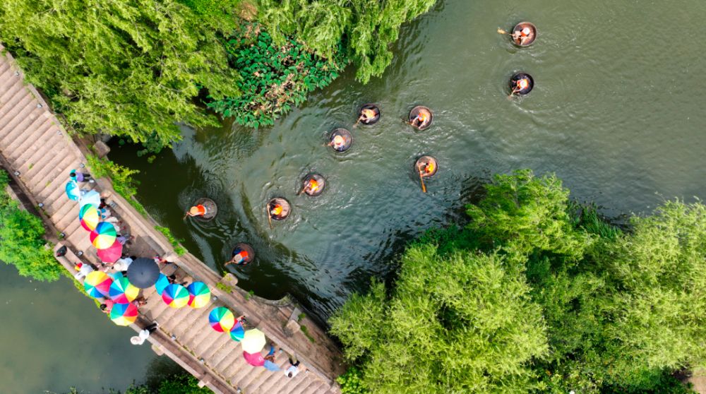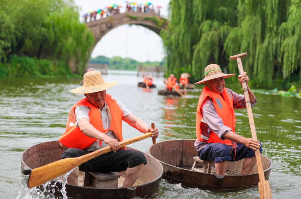 近日,中国浙江省湖州市钟管镇蠡山村开展了“水乡划菱桶 传统迎端午”活动。村民们划着菱桶在水面上你追我赶,营造出水乡特有的端午节日氛围。(图片来源:人民网)